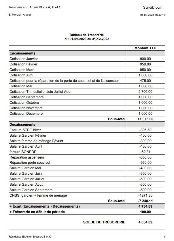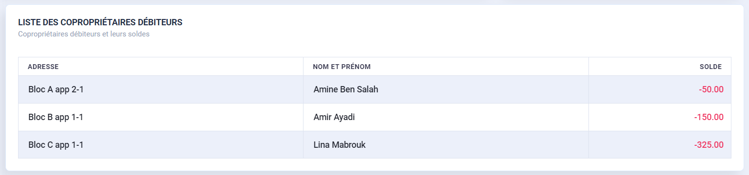 Le cœur de l'expérience: Notre Tableau de bord. Obtenez instantanément une vue complète de la santé financière et opérationnelle de votre copropriété. Suivez les chiffres clés tels que le solde de trésorerie, les encaissements et d'autres indicateurs essentiels. De plus, ne manquez jamais un rendez-vous important avec la date de la prochaine assemblée affichée en évidence. Restez informé grâce aux signalements des copropriétaires et surveillez les débiteurs avec leurs soldes respectifs.